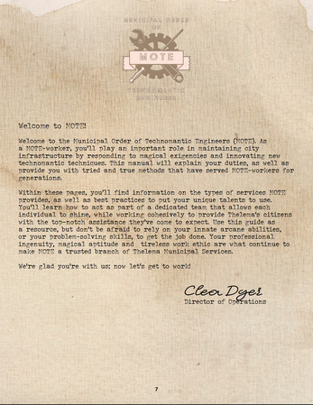 That's where the tireless workers of the Municipal Order of Technomantic Engineers--or MOTE--come in. It's their job to maintain magical utilities, repair artifacts, refresh wards, and deal with the occasional summoning gone wrong. If something breaks, they fix it, even if most citizens of Thelema take their services for granted.