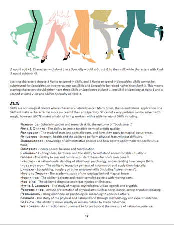 Mage to Order's setting works equally well for both episodic and single-session games, and gameplay is explicitly collaborative and narrative-driven. Advancement is tied to character milestones and focuses on Skill and Specialty acquisition, rather than on the accumulation of experience points.